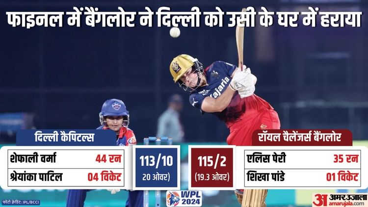 Article Delhi Capitals vs Royal Challengers Bangalore Highlights WPL Final 2024 Highlights: दिल्ली और बैंगलोर के बीच अब तक महिला प्रीमियर लीग में कुल पांच मैच खेले गए हैं और बैंगलोर ने पहली बार जीत हासिल की और वह भी फाइनल जैसे मैच में।