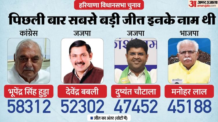 Article Haryana: हरियाणा में पिछले विधानसभा चुनाव में पांच सबसे बड़ी जीतों में दो सीटें भाजपा और जजपा तो एक सीट कांग्रेस के खाते में गई थी। सबसे बड़ी जीत करने वाले कांग्रेस के भूपेंद्र सिंह हुड्डा थे।